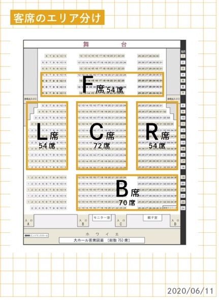 ・客席を『前方(F席)、後方(B席)、中央(C席)、左(L席)、右(R席)』の5ブロックに区分けし、それぞれの上限人数を席数の半分以下とします。